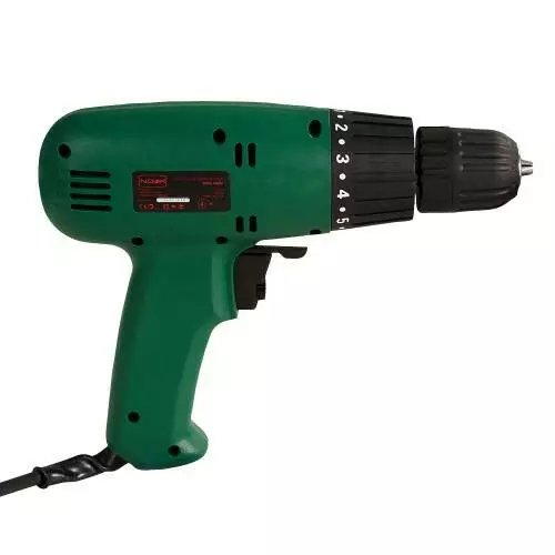 Прапорцевий реверс дозволяє змінювати напрямок обертання оснащення. Мережевий кабель прогумований, що розширює робочий діапазон температур. Потужність двигуна становить 400 Вт, а швидкозатискний патрон із максимальним діаметром оснащення до 10 мм робить цей дриль-шуруповерт універсальним інструментом. Модель постачається в кольоровій картонній коробці, а гарантія на інструмент становить 12 місяців.