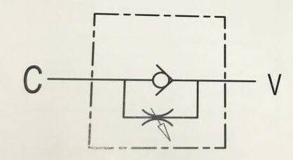 Клапан VRF 1" від Oleodinamica Marchesini, який регулює швидкість потоку робочої рідини в одному напрямку та забезпечує вільний потік в іншому. Оскільки в дроселі-бочку тиск не компенсується, то регулювання рідини залежить від тиску та в'язкості оливи.