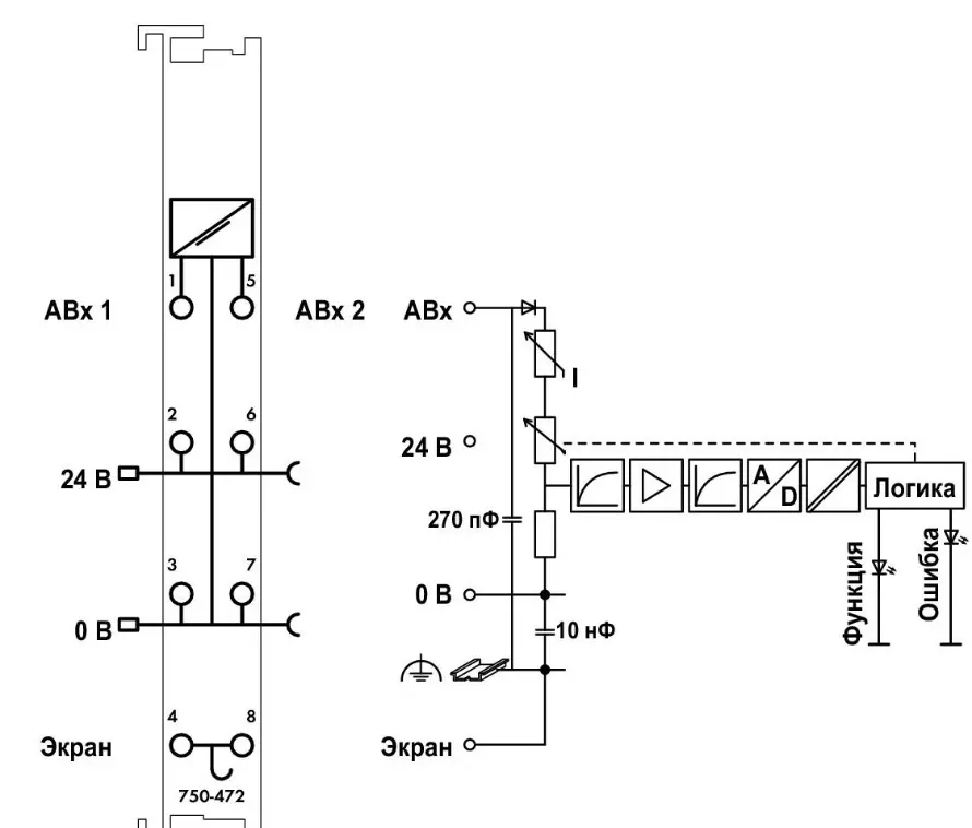 Двоаналоговый модуль введення забезпечує харчуванням 2-дротяні польові шини, може приймати і передавати аналогові сигнали на польові пристрої.