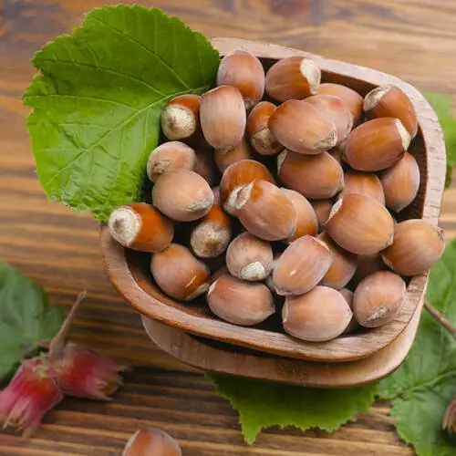 Плоди витягнуті, округлі, з гострим носиком масою близько 2,7 г кожен. Горіхи по 2-6 штук зібрані в китиці. Бордова плюска довша, ніж плід, має легке опушення. На поверхні щільної світло-коричневої шкаралупи є темні розлучення. Солодке ядро займає весь простір під нею.