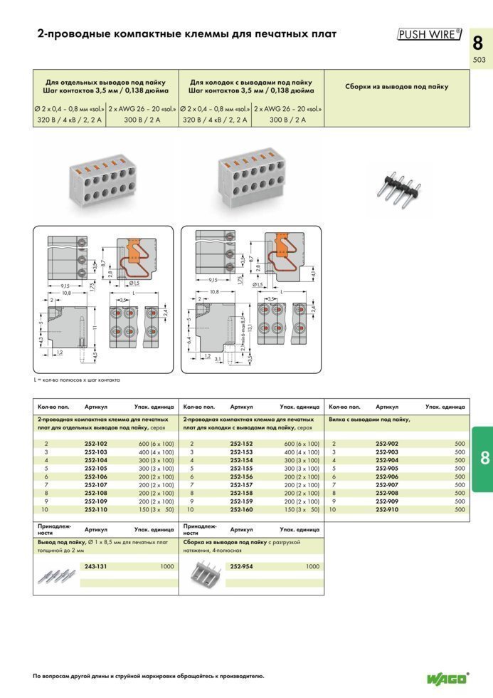 Двопровідною роз'їм на друковану плату Wago 252 серія, 9 конт., для вилок з виведеннями під пайку; нажимная кнопка; Ø 0,8 мм; Крок контактів 3,5 мм; 9-пол.; 0,80 mm²; сірі.