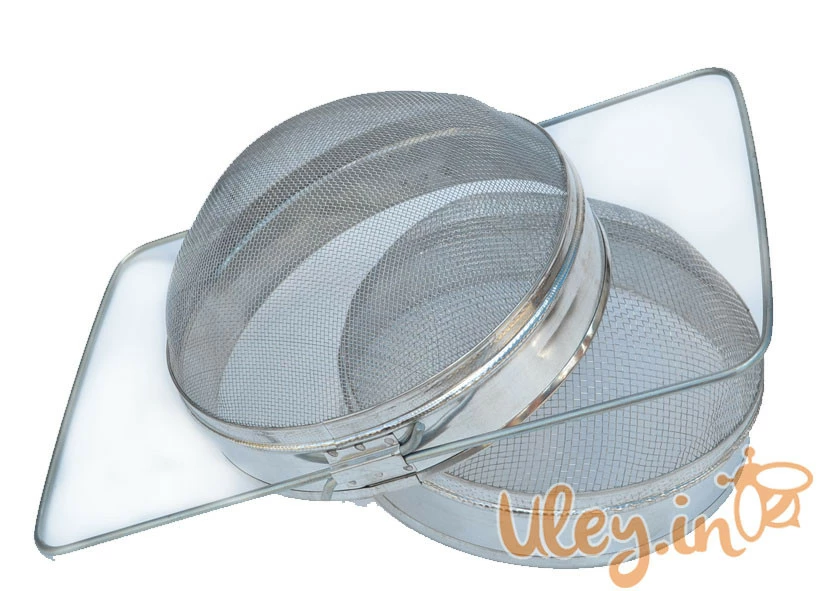 Фільтр (сито) для меду D-200 мм оцинкований двосекційний випуклий - призначений для очищення меду від шматочків воску і інших твердих частинок під час його зливу з бака медогонки в бідони або в іншу тару. У комплект фільтра входять дві секції з великої і дрібної осередком сітки. Нижня підтримуюча секція має опорну розсувну рамку.