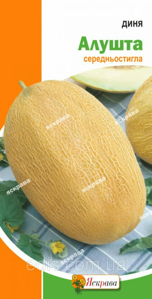 Диня 2 м АлуштаРанньостиглий, стійкий до повітряної і гунтовой посухи, сорт транспортабельний. Плоди дозрівають через 77 днів, після появи паростків. Плоди овальны, слабосморщенные, масою 1,8-2 кг. Забарвлення стиглих плодів з червоно-оранжевими плямами. М'якоть біла, товста, солодка, соковита з динним ароматом. Використовується у свіжому вигляді. Теплолюбна культура, тому насіння висівають у грунт при наявності температури +18-20 С. Норма висіву 2 насінини на 1 пог.м., глибина воронки 3-4 см, ширина міжрядь 70-90 див.