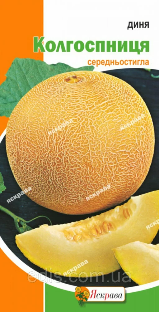Диня Колгоспниця 2 г Ранньостиглий, високопродуктивний сорт. Вегетаційний період від сходів до збору врожаю складає 74-92 дня. Середньостиглий сорт. Плоди дозрівають через 73-90 днів після появи сходів. Врожайність - до 180 ц з гектара. Плоди кулясті, без візерунка. Забарвлення стиглих плодів - жовто-помаранчеве з зеленуватим відтінком. М'якоть біла, щільна, слабо хрустка, в'язкий зі слабким ароматом. Ціниться за вміст цукру від 11 % до 12 % і приємний смак. Використовується у свіжому вигляді.