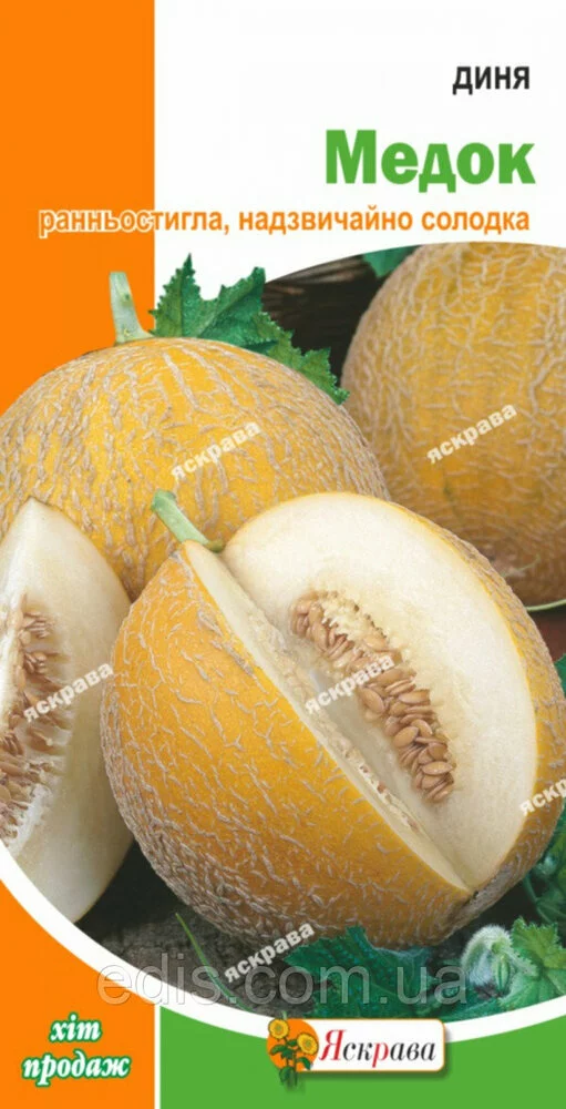 Диня Медок 2 гНеперевершений ранньостиглий сорт. Медок - «диво» селекції. Дозрівання настає на 80-85 день. Ароматні плоди, масою 2-4 кг з дуже смачною і ніжною м'якоттю. Крім цих унікальних якостей, володіє наступними цінностями: швидко росте, не вражається хворобами, транспортабельна. Завдяки підвищеному вмісту цукру, з неї виходять дивовижні східні солодощі, цукати, оригінальні маринади. Агротехніка: Диню вирощують у відкритому гунте і теплицях, на легких киснево-і водопроникних ґрунтах. Перед сівбою насіння обробляють у розчині марганцевокислого калію, потім промивають чистою водою. Посів проводиться орієнтовно в травні, коли грунт прогріється на глибину 8-10 см до 15-16 ° С. Схема посадки 140 х 50 див. В теплицях 70 х 40 см, з використанням шпалер, (плоди можна підвішувати в сітках). Застосовують також розсадний спосіб вирощування. У цьому випадку розсаду висаджують після останніх заморозків у стадії 3-4 справжніх листків. У міру росту рослини формують в одне стебло, виробляючи видалення бічних пагонів і залишають на ньому 2-3 зав'язі, (інші видаляють). Подальший догляд складається з помірного поливання, розпушування грунту, підживлення і присипки батогів для оберігання їх від перевертання вітром.