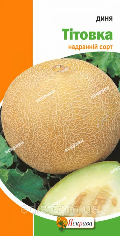 Диня Тітовка 2 гРанньостиглий сорт. Вегетаційний період від сходів до технічної стиглості 60-80 днів. Перспективний сорт, дозрівання плодів за 55 - 70 днів. Транспортабельний. Врожайність - 90 - 100 ц. Плід округлий або короткоовальный, жовто-оранжевого кольору, з сегментами губою сітки, масою 1,5 - 2 кг М'якуш товстий, білий, ніжний, солодкий, запашний, слабо волокнистий. Вміст цукру - 6,8 %, сухих речовин - 10,4 %. Використовується у свіжому вигляді.