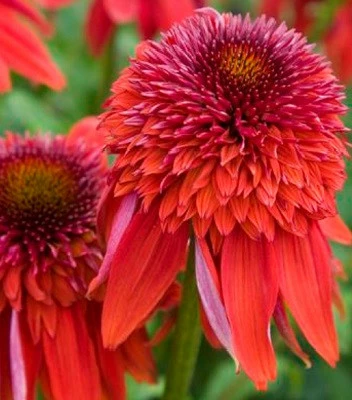 Елегантний красень з великими красивими квітами яскраво-червоного забарвлення. Квіти представлені у вигляді густомахрового сферичного помпона, з променевим розташуванням нижніх довгих пелюсток. При розпусканні спостерігається пурпурно-фіолетовий центр. Віддає перевагу сонячним ділянкам, переносить і півтінь, але цвітіння не таке рясне і яскраве. Добре росте на зволожених, родючих, добре дренованих грунтах. Особливо ефектний сорт висаджений у групових посадках з контрастними за кольором іншими сортами ехінацеї. Морозостійкий.