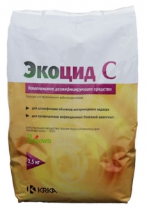 Екоцид С водорозчинний порошок для дезінфекції Опис: Дрібногранульований порошок рожево-сірого кольору із запахом лимона добре розчинний у воді. Склад: 100 г препарату містять діючу речовину: калію пероксимоносульфат — 50,0 г Застосування: Препарат застосовується для дезінфекції тваринницьких та птахівничих приміщень, систем подачі питної води, цехів по переробці птиці та яєць, забійних та м'ясопереробних цехів, транспортних засобів, обладнання, поверхонь, приладів, інструментарію, санітарно-технічного обладнання та інших об'єктів, які підлягають ветеринарному нагляду. Дозування Робочий розчин Екоцид С застосовується методом вологої дезінфекції, аерозольного розпилення, туману, ванни для копит або дезбар'єра. Для приготування робочого розчину рекомендується використовувати теплу воду, в якій препарат розчиняється швидше і рівномірніше. - Завершальна дезінфекція приміщення проводитися 1% розчином екоцид С за допомогою розпилювача низького тиску в дозі 300 мл/м2. Експозиція становить від 2 до 3 годин. - Аерозольна дезінфекція (холодна), в приміщеннях вільних від тварин, проводиться 1% розчином екоцид С, за допомогою механічних аерозольних генераторів в дозі 1 л/100 м3. Експозиція - 30-60 хвилин. Перед введенням тварин або птиці приміщення провітрюється протягом 30-60 хвилин. - Аерозольна дезінфекція (тепла), в приміщеннях вільних від тварин, проводиться 4% розчином екоцид С, в дозі 1 л/100 м3. Експозиція - 30-60 хвилин. Перед введенням тварин або птиці приміщення провітрюється протягом 30-60 хвилин. Для утворення стійкого туману рекомендується додавати підсилює агент (наприклад: гліцерин) у розрахунку: 40 гр екоцид С + 850 мл води + 150 мл гліцерину. - Для дезінфекції робочих поверхонь, обладнання, приладів, зворотної тари, інструментарію використовується 0,5% -3%-й розчин екоцид С (залежно від ступеня забруднення) в дозі 300 мл/м2. Експозиція - від 15 до 60 хвилин. Потім обполіскують водою. Дезінфекція рук - 0,5% розчин екоцид С. - Санація повітря в присутність тварин або птиці, з метою знищення перехресних інфекцій в період спалаху захворювань, проводиться 0,5% розчином екоцид С в дозі 1л/100м3. Експозиція становить 30-60 хвилин. - Дезінфекція системи водопостачання, молокопровода проводиться 0,5% розчином екоцид С. Робочим розчином екоцид С заповнюють резервуар для питної води і систему подачі води. Експозиція 60 хвилин. Через 60 хвилин систему промивають чистою водою. - Дезінфекція питної води проводиться 0,1% розчином екоцид С. Для забезпечення постійної дезінфекції питної води або з метою підкислення води в резервуар додають відповідну кількість екоцид С (1 кг препарату на 1000 л води) або відповідну кількість робочого розчину через автоматичний дозатор. - Дезінфекція бар'єрів, дезковриков, коліс транспортних засобів, взуття, «копитних ванн» проводиться 1% розчином екоцид С. Розчин в дезбар'єра і ваннах змінюють кожні 4 дні або в міру забруднення. - Дезінфекція інкубаційних яєць проводиться 1-2% (залежно від ступеня забруднення) розчином екоцид С методом аерозольного розпилення (спрей), туману, вологого обприскування в дозі 1 л/10 м2. Експозиція - 30 хвилин. - Дезінфекція інкубаторів та вивідних шаф проводиться 0,5-1% розчином екоцид С методом розпилення в дозі 300 мл/м2. Експозиція - 30 хвилин. Протипоказання: Не має. Застереження Дезінфекція проводиться у відсутності тварин та птиці. В