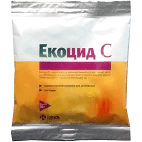 Екоцид С водорозчинний порошок для дезінфекції Опис: Дрібногранульований порошок рожево-сірого кольору із запахом лимона добре розчинний у воді. Склад: 100 г препарату містять діючу речовину: калію пероксимоносульфат — 50,0 г Застосування: Препарат застосовується для дезінфекції тваринницьких та птахівничих приміщень, систем подачі питної води, цехів по переробці птиці та яєць, забійних та м'ясопереробних цехів, транспортних засобів, обладнання, поверхонь, приладів, інструментарію, санітарно-технічного обладнання та інших об'єктів, які підлягають ветеринарному нагляду. Дозування Робочий розчин Екоцид С застосовується методом вологої дезінфекції, аерозольного розпилення, туману, ванни для копит або дезбар'єра. Для приготування робочого розчину рекомендується використовувати теплу воду, в якій препарат розчиняється швидше і рівномірніше. - Завершальна дезінфекція приміщення проводитися 1% розчином екоцид С за допомогою розпилювача низького тиску в дозі 300 мл/м2. Експозиція становить від 2 до 3 годин. - Аерозольна дезінфекція (холодна), в приміщеннях вільних від тварин, проводиться 1% розчином екоцид С, за допомогою механічних аерозольних генераторів в дозі 1 л/100 м3. Експозиція - 30-60 хвилин. Перед введенням тварин або птиці приміщення провітрюється протягом 30-60 хвилин. - Аерозольна дезінфекція (тепла), в приміщеннях вільних від тварин, проводиться 4% розчином екоцид С, в дозі 1 л/100 м3. Експозиція - 30-60 хвилин. Перед введенням тварин або птиці приміщення провітрюється протягом 30-60 хвилин. Для утворення стійкого туману рекомендується додавати підсилює агент (наприклад: гліцерин) у розрахунку: 40 гр екоцид С + 850 мл води + 150 мл гліцерину. - Для дезінфекції робочих поверхонь, обладнання, приладів, зворотної тари, інструментарію використовується 0,5% -3%-й розчин екоцид С (залежно від ступеня забруднення) в дозі 300 мл/м2. Експозиція - від 15 до 60 хвилин. Потім обполіскують водою. Дезінфекція рук - 0,5% розчин екоцид С. - Санація повітря в присутність тварин або птиці, з метою знищення перехресних інфекцій в період спалаху захворювань, проводиться 0,5% розчином екоцид С в дозі 1л/100м3. Експозиція становить 30-60 хвилин. - Дезінфекція системи водопостачання, молокопровода проводиться 0,5% розчином екоцид С. Робочим розчином екоцид С заповнюють резервуар для питної води і систему подачі води. Експозиція 60 хвилин. Через 60 хвилин систему промивають чистою водою. - Дезінфекція питної води проводиться 0,1% розчином екоцид С. Для забезпечення постійної дезінфекції питної води або з метою підкислення води в резервуар додають відповідну кількість екоцид С (1 кг препарату на 1000 л води) або відповідну кількість робочого розчину через автоматичний дозатор. - Дезінфекція бар'єрів, дезковриков, коліс транспортних засобів, взуття, «копитних ванн» проводиться 1% розчином екоцид С. Розчин в дезбар'єра і ваннах змінюють кожні 4 дні або в міру забруднення. - Дезінфекція інкубаційних яєць проводиться 1-2% (залежно від ступеня забруднення) розчином екоцид С методом аерозольного розпилення (спрей), туману, вологого обприскування в дозі 1 л/10 м2. Експозиція - 30 хвилин. - Дезінфекція інкубаторів та вивідних шаф проводиться 0,5-1% розчином екоцид С методом розпилення в дозі 300 мл/м2. Експозиція - 30 хвилин. Протипоказання: Не має. Застереження Дезінфекція проводиться у відсутності тварин та птиці. В