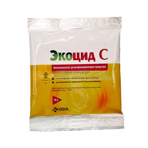 Екоцид С - комплексний дезінфікуючий засіб у формі порошку, що містить в 1 г як діюча речовина 500 мг калію пероксомоносульфату (потрійна сіль). Як допоміжні компоненти: поверхнево-активна речовина - додецилбензол сульфонат натрію, органічні кислоти (яблучна, сульфамова), неорганічні буферні системи (хлорид натрію, поліфосфат натрію), барвник Азо Дієстафф і аромат Цитрон із запахом лимона. На вигляд є гранульований порошок рожево-сірого кольору, зі слабким запахом лимона, легко розчинний у воді.
