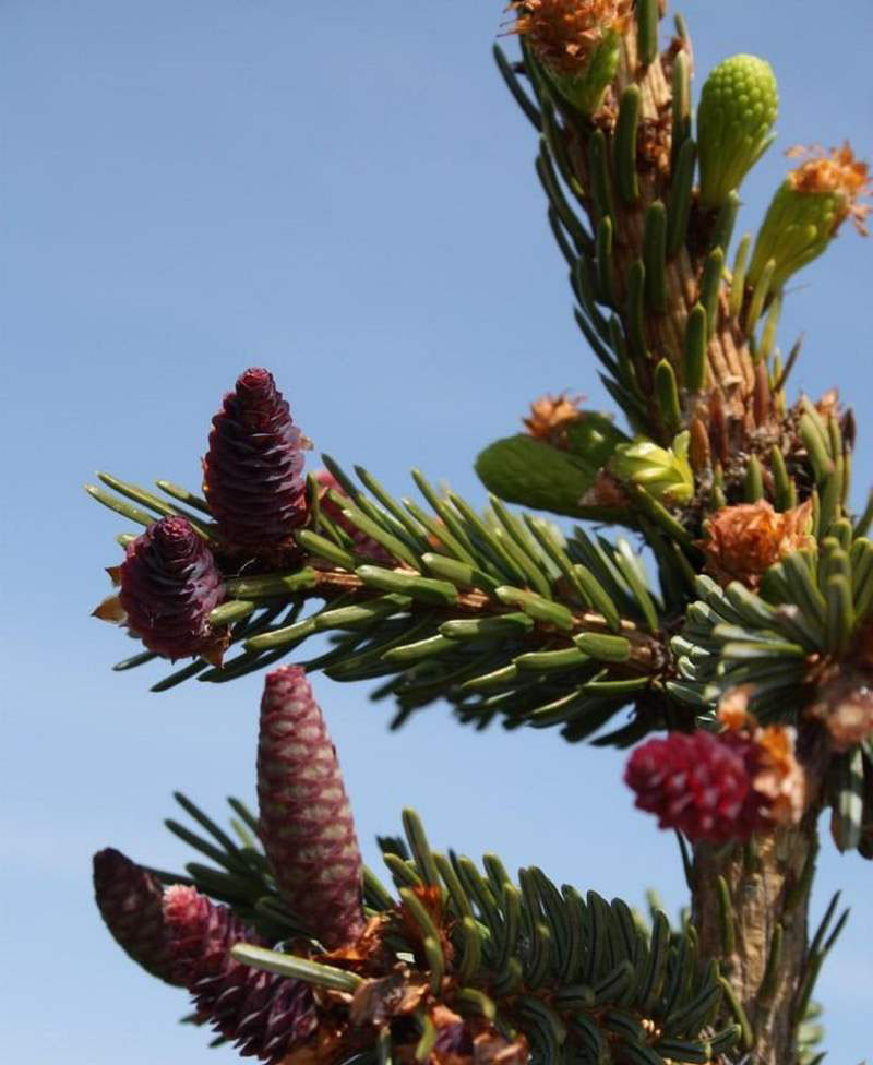 Зовнішній вигляд - вузька плакуча форма крони, гілки прилягають до стовбура. Хвоя темно-зелена, шишки дрібні фіолетово-червоні, а коли дозрівають, стають коричневими.