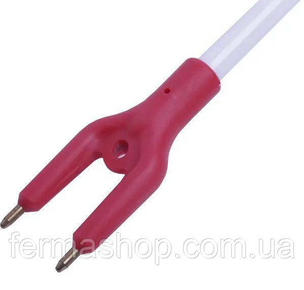 При нажатии на кнопку, производиться звуковой писк что придает психологичный эффект над животными. Длина хлыста становит 71 см, вся длина электро-погонялки 98 см.
