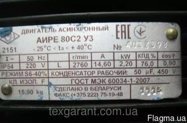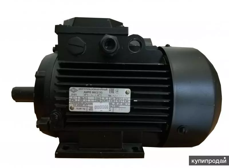 Однофазный электродвигатель  АИРЕ80C2,  мощность 2,2 кВт (в режиме работы — S6-40%) или 1,8 кВт (в режиме работы S1): о режимах работы . Синхронная частота вращения ротора — 3000 оборотов в минуту. Крышки однофазного электродвигателя (т.е. подшипниковые щиты) изготовлены из силумина (сплав алюминия с кремнием). Однофазный электродвигатель АИРЕ80С2 работает с пристроенным рабочим конденсатором, конденсатор входит в комплект поставки.