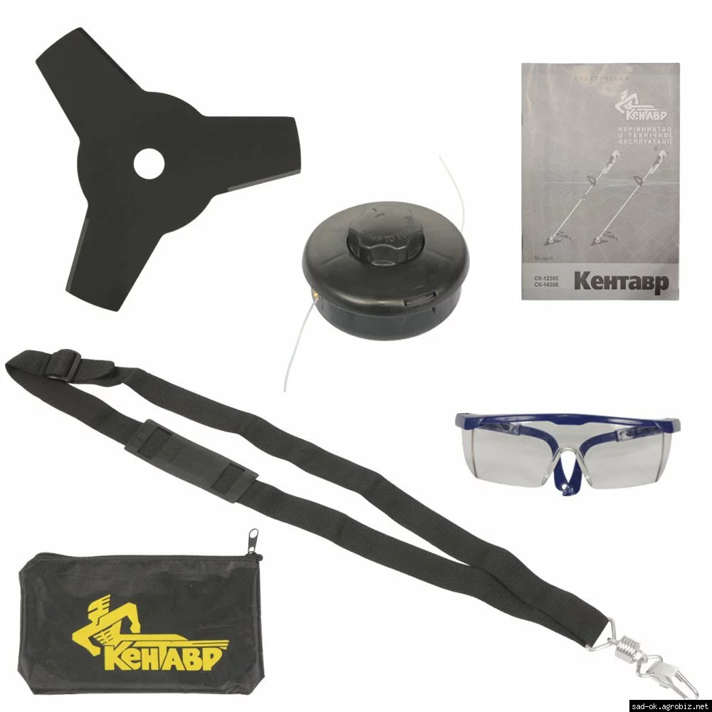 Электрокоса Кентавр СК-1438Е имеет расширинную комплектацию. В комплект поставки данной модели входят наплечный ремень с карабином, 3-зубчатый режущий нож, шпуля с леской, большой защитный кожух, удобные защитные очки, сумка с логотипом торговой марки с запасными инструментами и принадлежностями.