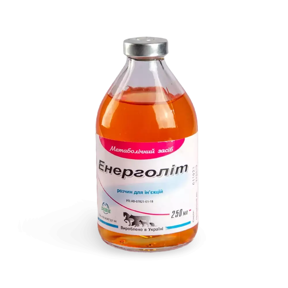 Опис: розчин для ін’єкцій/інфузій жовто-помаранчевого кольору. Склад: глюкоза – 30 мг, сорбітол – 20 мг, ацетат натрію – 2,6 мг, натрію хлорид – 6 мг, калію хлорид – 0,4 мг, кальцію хлорид – 0,2 мг, магнію хлорид -0,2 мг, вітаміни В1, В2, В3, В5, В6, В12, аргінін, глютамінова кислота, лізин,метіонін, наповнювач – до 1 мл. Фармакологічні властивості: Енерголіт – комплексний препарат у етіотропній, симптоматичній, заміщуючій терапії неінфекційних та інфекційних захворювань, корекції та нормалізації обмінних процесів у тварин. Препарат містить вуглеводи як джерело енергії у двох формах – швидко метаболізуємого (глюкоза) та сповільнено метаболізуємого (сорбітол). Це забезпечує організм енергетичним субстратом на тривалий час, мінімізує коливання вмісту глюкози в крові та навантаження на печінку, підшлункову залозу, тощо. Ацетат натрію володіє буферними властивостями і нейтралізує надлишкові органічні кислоти, які накопичуються при ацидозах. Катіони натрію, калію, магнію та кальцію є життєво необхідними електролітами для підтримки водно-сольового балансу організму, тонусу мускулатури,тощо. Вітаміни В1, В2, В3, В5, В6, В12 є кофакторами багатьох ферментів, які беруть участь у внутрішньоклітинному метаболізмі. Амінокислоти є не тільки мономерами структурних, регуляторних та ензимних білків, а й регуляторами судинного тонусу (аргінін) та акцепторами аміаку (глютамінова кислота). Застосування: призначають всім видам сільськогосподарських тварин, собакам, кішкам, хутровим звірям. Застосовують в якості засобу регідратації, адаптогену та анаболічного засобу, для нормалізації і стимуляції обмінних процесів при захворюваннях різної етіології, токсикозах, профілактики кетозу та ацидотичних станів, тощо. Дозування: препарат застосовують внутрішньовенно, інтраперитонеально або підшкірно, раз або двічі на добу. Одноразове дозування одній тварині: Велика рогата худоба, свині, коні, дрібна рогата худоба – 50-100 мл на 100 кг маси тіла, Телята, лошата, молодняк дрібної рогатої худоби та свиней – 10-25 мл на 10 кг маси тіла, Собаки, кішки, хутрові звірі – 3-5 мл на кілограм маси тіла. Протипоказання: індивідуальна чутливість до компонентів препарату. Каренція: продукцію тваринництва використовують без обмежень. Форма випуску: флакони по 250 мл.