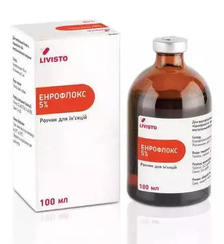 Антибактеріальний лікарський препарат на основі енрофлоксацину у вигляді ін'єкційного розчину для лікування великої та дрібної рогатої худоби, свиней, а також кішок та собак при захворюваннях бактеріальної та мікоплазмової етіології.