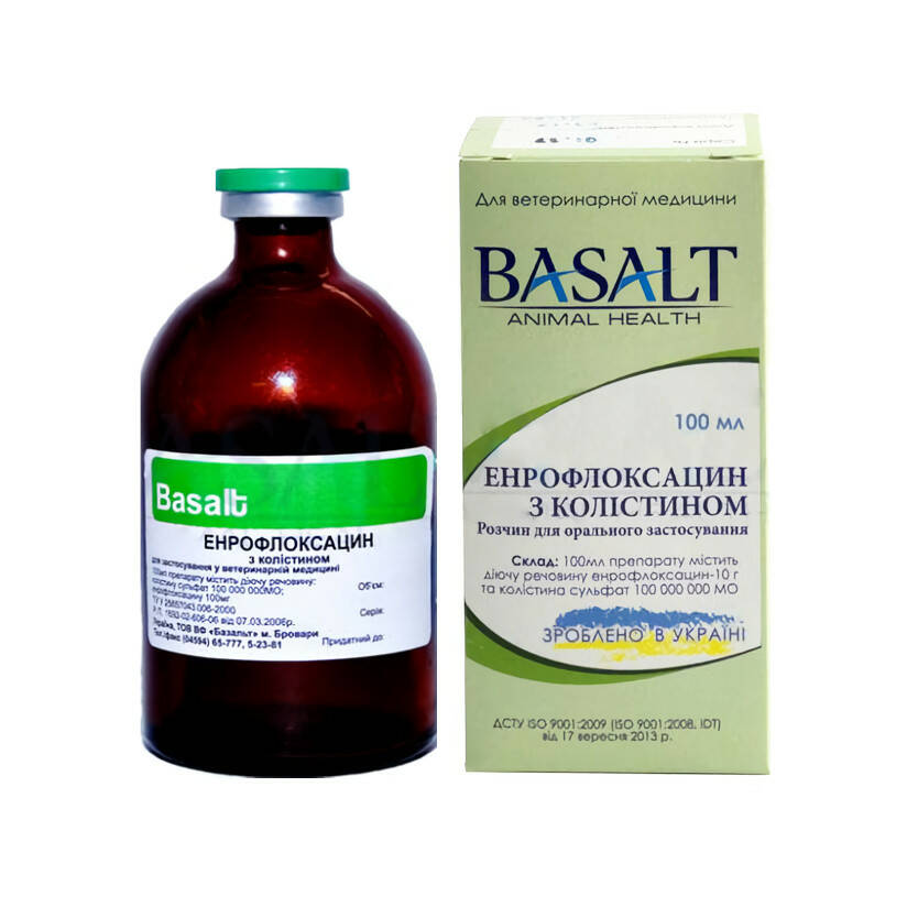 Комплексний протімікробній препарат для тварин в 100 мл містіться 100 000 000 МО колістіна сульфат и 10 г енрофлоксаціну, Допоміжні Речовини: бензиловий спирт, молочна кислота и дістільована вода.
