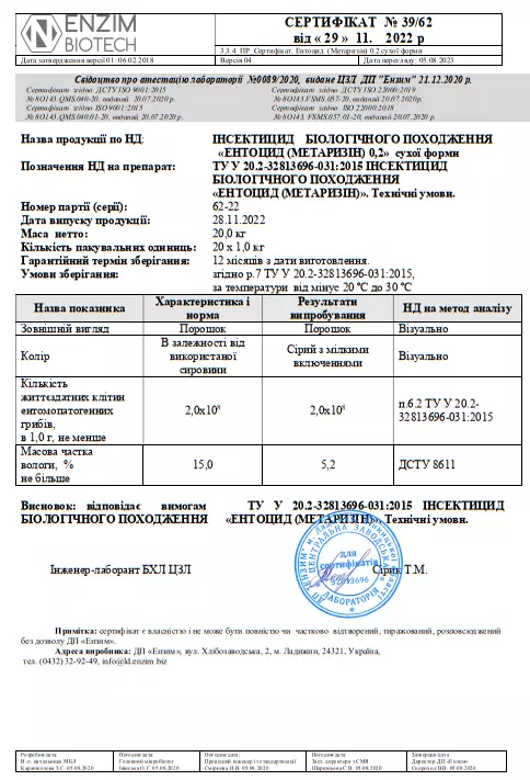 Состав препарата : Міцелей і спори грибів Metarhizium spp., Beauveria spp., Lecanicillium spp., Paecilomyces spp.