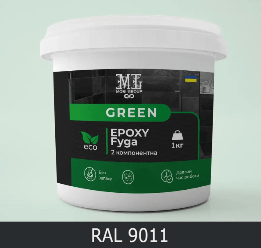Епоксидна затирка (фуга) для плитки Green Epoxy Fyga 1кг + Змивка для епоксидної фуги Lava (легко змивається, середнє зерно) Чорний RAL 9011