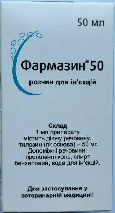 Фармазин 50 – лікарський препарат, що містить як активну речовину антибіотик тилозин у формі основи в органічному розчиннику. Фармазин 50 містить 50 мг тилозину в 1 мл. Препарат є ін'єкційним розчином світло-жовтого кольору. Випускають у флаконах по 50 мл, які укладають у картонні коробки.