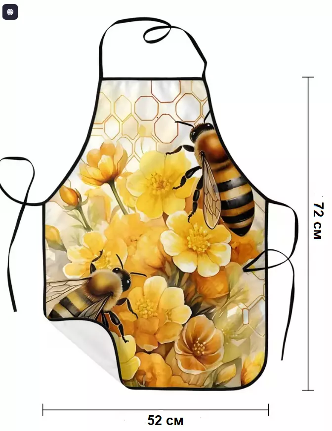 Насичений принт із деталізованими бджолами та жовтими квітами створює теплий, сонячний настрій і одразу привертає увагу. Малюнок виглядає живим і об’ємним, асоціюється з медом, літом та натуральністю, тому фартух чудово підходить для пасічників, кулінарів, майстрів хендмейду або як стильний подарунок.