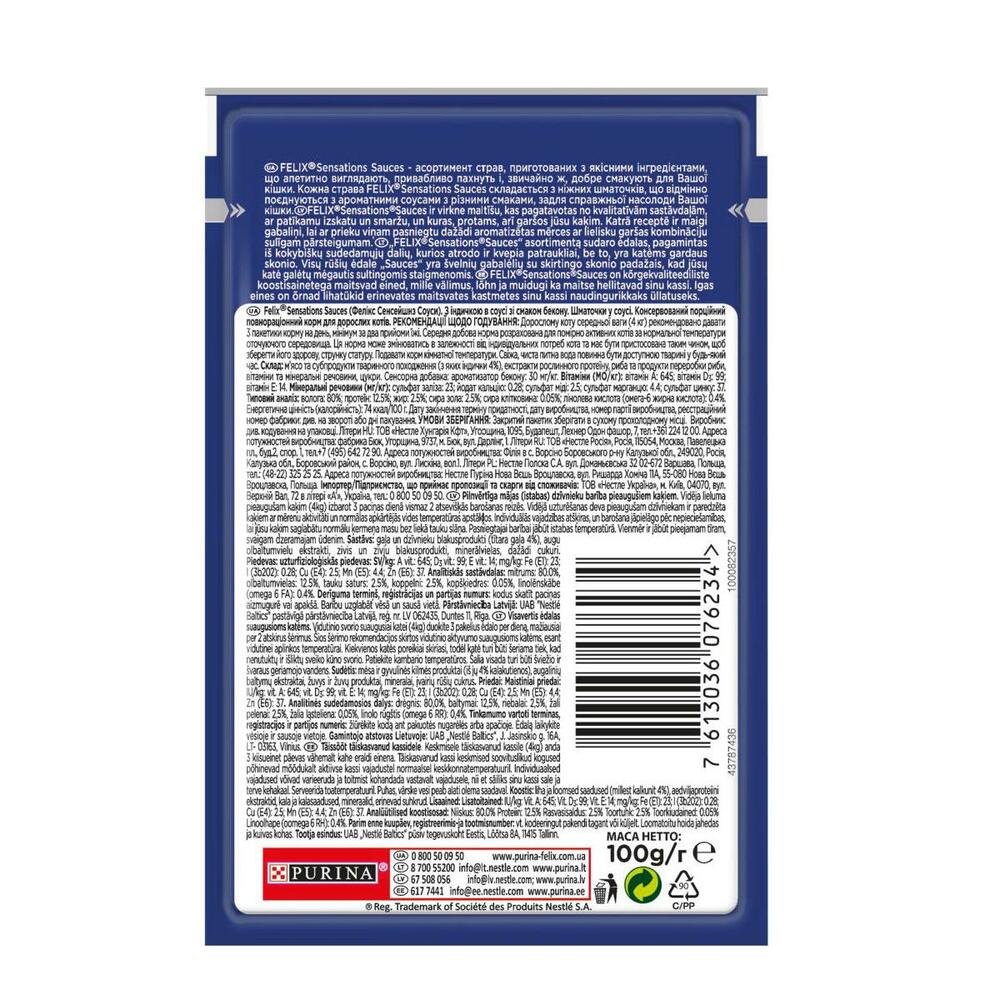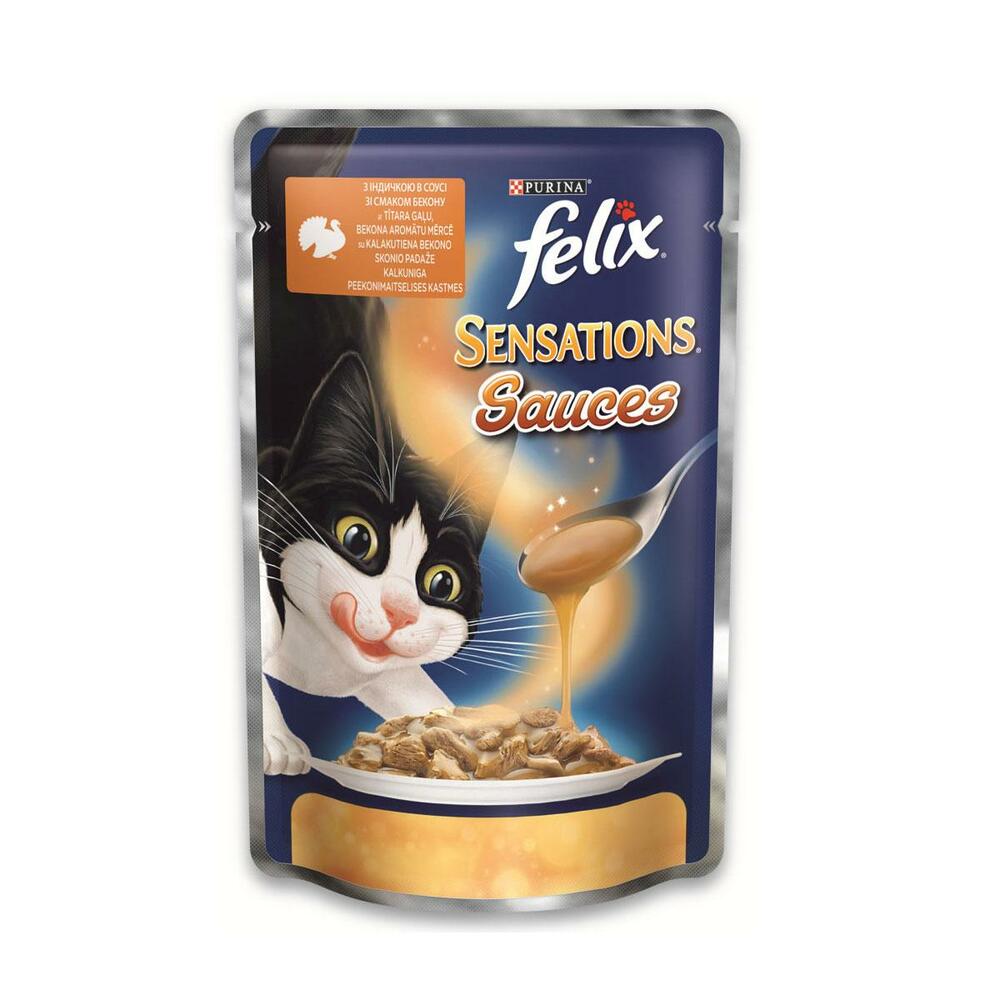 Felix Sensation Sauces Консерви для кішок з індичкою в соусі Повнораціонний консервований корм для дорослих кішок, шматочки індички в соусі і смаком бекону Склад: