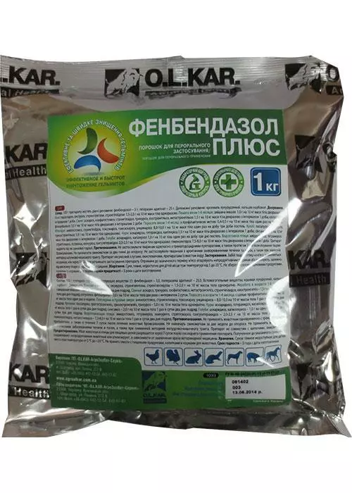 100 г препарату містять речовини, що діють: фенбендазол 3 г; піперазин адипінат 25 г. крохмаль кукурудзяний, кальцій карбонат.