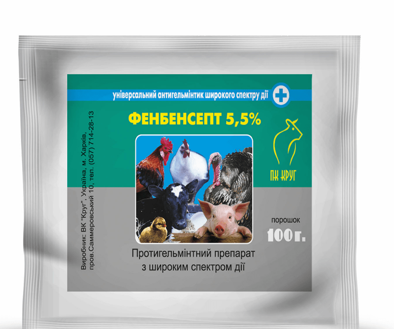 "ФЕНБЕНСЕПТ (ПОРОШОК 5,5%)" - антигельмінтний засіб для дегельмінтизації с/г тварин і птахів, 100г (Круг)