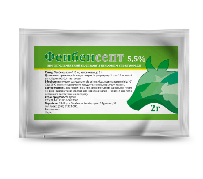 "ФЕНБЕНСЕПТ (ПОРОШОК, 5,5%)" - антигельмінтний засіб для дегельмінтизації с/г тварин і птахів, 2гр (Круг