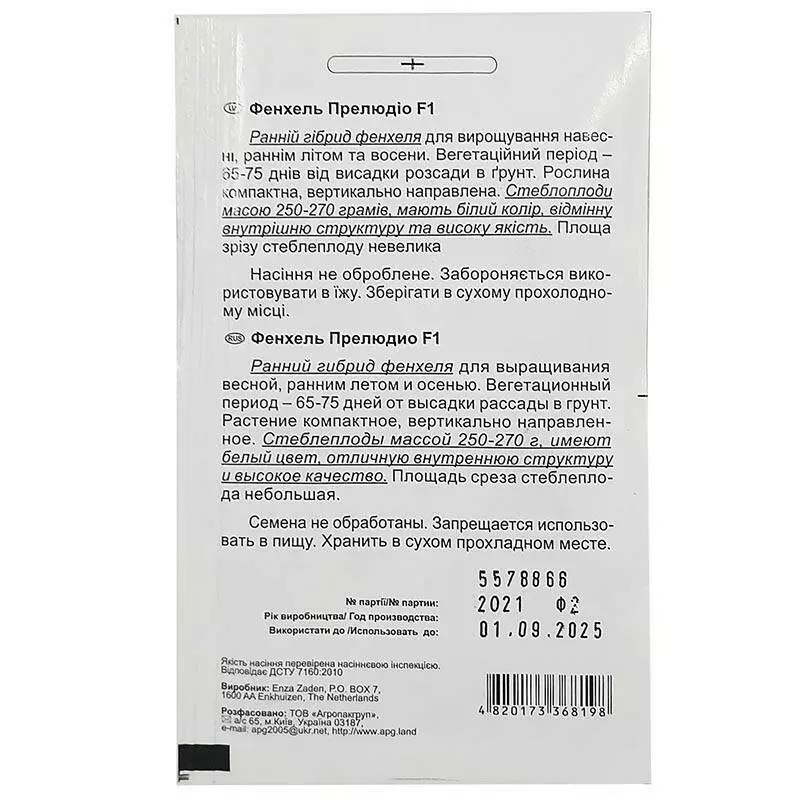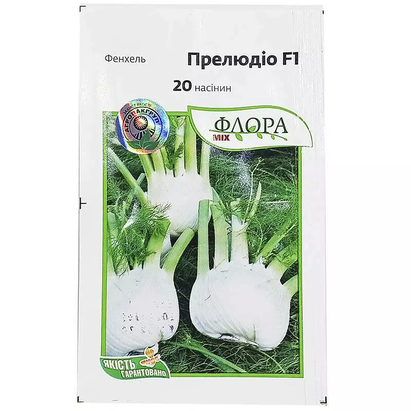 Фенхель Прелюдіо F1 - гідрід раннього терміну дозрівання для вирощування на відкритому грунті весною, літом та осінню. Вегетаційний період формування луковин фенхелю складає 65-75 днів, після пересадки розсади на постійне місце зростання. Рослина потужне, компактне, формує прямостояче баділля без порожнеч. Плоди фенхелю Прелюдіо вирівняні, однорідні білого кольору, мають відмінні смакові якості та аромат. Широко використовується у кулінарії.