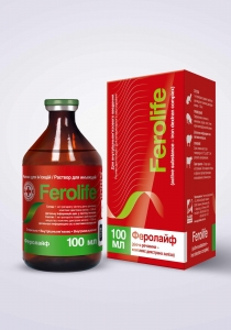 Опис Розчин стерильний червоно-бурого кольору. Склад 1мл препарату містить діючу речовину: комплекс декстрана заліза - 100 мг. Фармакологічні властивості Комплексна сполука гідроокису заліза і низькомолекулярного декстрину поповнює дефіцит заліза, стимулює кровотворну систему, підвищує рівень гемоглобіну, сприяє збільшенню кількості еритроцитів і покращує збереження молодняку сільськогосподарських тварин. Застосування Профілактика та лікування свиноматок, поросят, телят, ягнят, норок при залізодефіцитній анемії . Дозування Феролайф вводять глибоко внутрішньом'язово в області стегна або шиї. Перед введенням препарату флакон підігрівають до температури 36-38 °С. Дози з профілактичною метою: - поросята 3-4 - добового віку - 1,5-2 мл, одноразово; - телята 5-6 - добового віку - 8-10 мл, одноразово; - ягнята 3-5 - добового віку - 2-3 мл, одноразово; - норки - 0,3-0,5 мл, одноразово; - свиноматки - 10 мл, одноразово за 3-4 тижні до опоросу. З лікувальною метою препарат вводять 2 рази з інтервалом 7 днів в тих же дозах. Протипоказання Не встановлені. Застереження Можливі алергічні прояви.У місці введення може виникати легкий набряк , який зникає за декілька діб. Форма випуску Флакони скляні по 10, 20, 50, 100 та 200 мл, закриті гумовим корком під алюмінієву обкатку. Зберігання Сухе темне місце при температурі від 5°С до 25 °С. Не допускати замерзання. Термін придатності - 3 роки з дати виготовлення. Термін придатності ( після першого відкриття флакона ) - 28 діб.