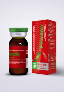 Опис Розчин стерильний червоно-бурого кольору. Склад 1мл препарату містить діючу речовину: комплекс декстрана заліза - 100 мг. Фармакологічні властивості Комплексна сполука гідроокису заліза і низькомолекулярного декстрину поповнює дефіцит заліза, стимулює кровотворну систему, підвищує рівень гемоглобіну, сприяє збільшенню кількості еритроцитів і покращує збереження молодняку сільськогосподарських тварин. Застосування Профілактика та лікування свиноматок, поросят, телят, ягнят, норок при залізодефіцитній анемії . Дозування Феролайф вводять глибоко внутрішньом'язово в області стегна або шиї. Перед введенням препарату флакон підігрівають до температури 36-38 °С. Дози з профілактичною метою: - поросята 3-4 - добового віку - 1,5-2 мл, одноразово; - телята 5-6 - добового віку - 8-10 мл, одноразово; - ягнята 3-5 - добового віку - 2-3 мл, одноразово; - норки - 0,3-0,5 мл, одноразово; - свиноматки - 10 мл, одноразово за 3-4 тижні до опоросу. З лікувальною метою препарат вводять 2 рази з інтервалом 7 днів в тих же дозах. Протипоказання Не встановлені. Застереження Можливі алергічні прояви.У місці введення може виникати легкий набряк , який зникає за декілька діб. Форма випуску Флакони скляні по 10, 20, 50, 100 та 200 мл, закриті гумовим корком під алюмінієву обкатку. Зберігання Сухе темне місце при температурі від 5°С до 25 °С. Не допускати замерзання. Термін придатності - 3 роки з дати виготовлення. Термін придатності ( після першого відкриття флакона ) - 28 діб.