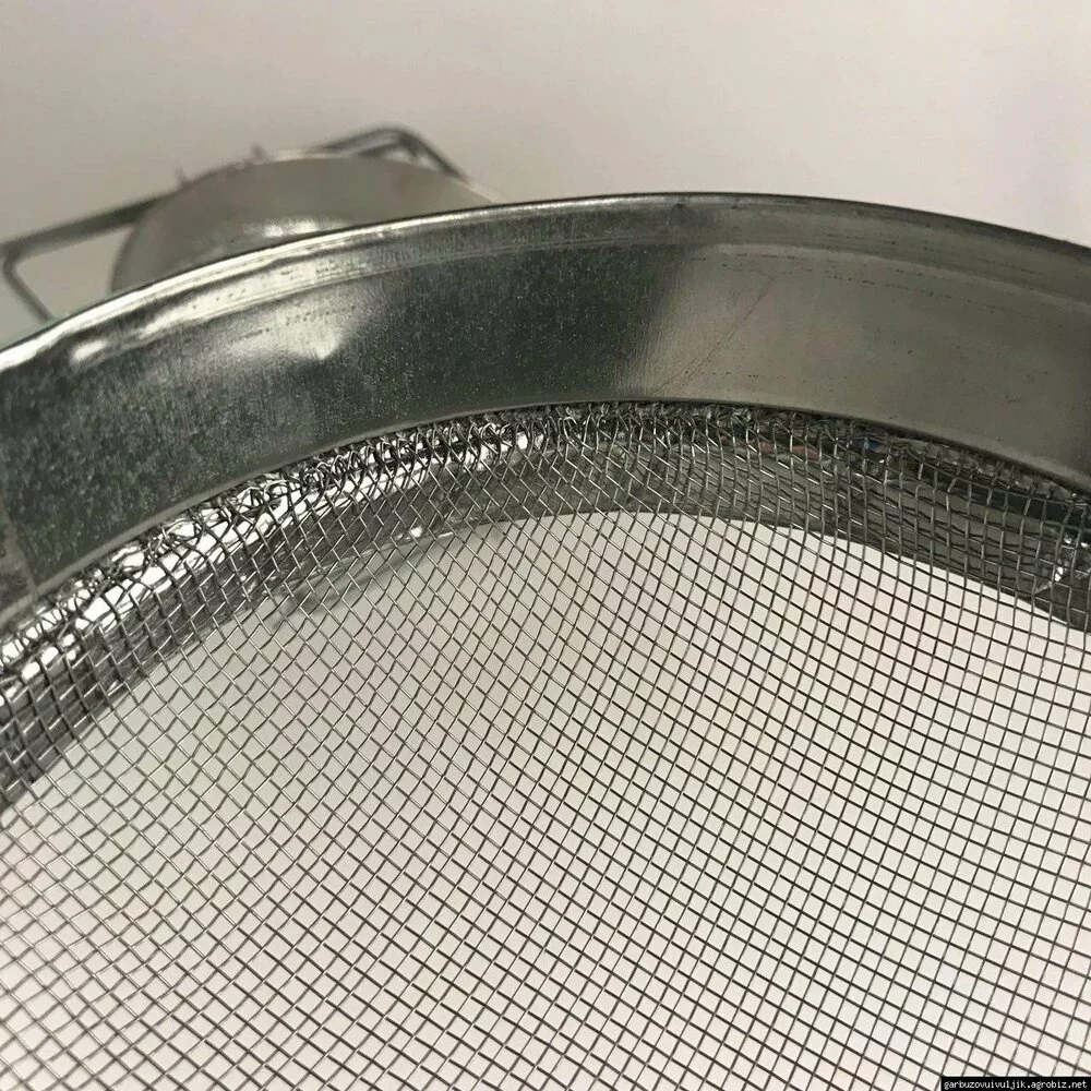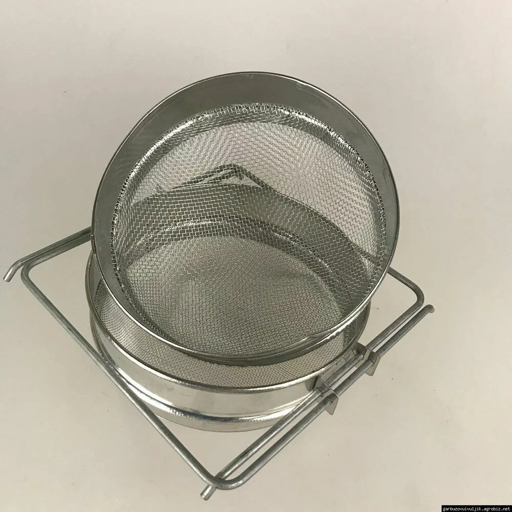 Фільтр бджолярський діаметром 15 см з двома сітками. Перша сітка фільтра з великими отворами використовується для грубого очищення меду від великих часток, а друга сітка з дрібними отворами дозволяє очистити мед від дрібних часточок. Для кристально чистого очищення меду від часточок необхідно фільтрувати мед спеціальним нейлоновим фільтром для тонкого очищення. Фільтр виготовляється з сітки сферичної форми (напівкруглої) або з прямої сітки. Сталь у виготовленні фільтрів також буває різна - нержавіюча або оцинкована. Нижня частина фільтра для меду має висувні ручки для установки фільтра на горловину будь-якої ємності діаметром більше 15 сантиметрів.