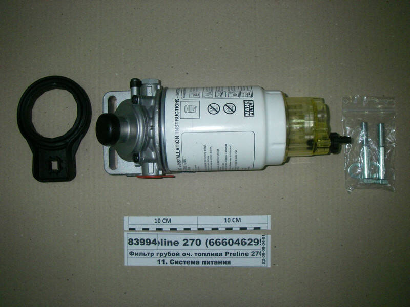 Фильтр для устанавливается на автомобилях КАМАЗ, МАЗ, так же можно становить на любой технике с дизельным двигателем, и с расходом топлива, анологичному КАМАЗу. Фильтр имеет насос подкачки мембранного типа и колбу прозрачную, для визуального определения наличия воды и грязи.