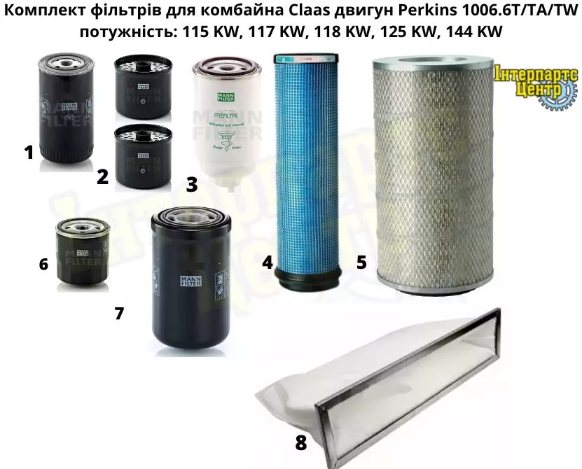 Комплект фільтрів для комбайнів Claas з двигуном Perkins 1006.6T (1006.60T) TA / TW, потужність: 115 KW, 117 KW, 118 KW, 125 KW, 144 KW.