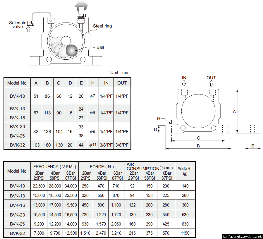 Таблица характеристик пневматических шариковых вибраторов FineTek
