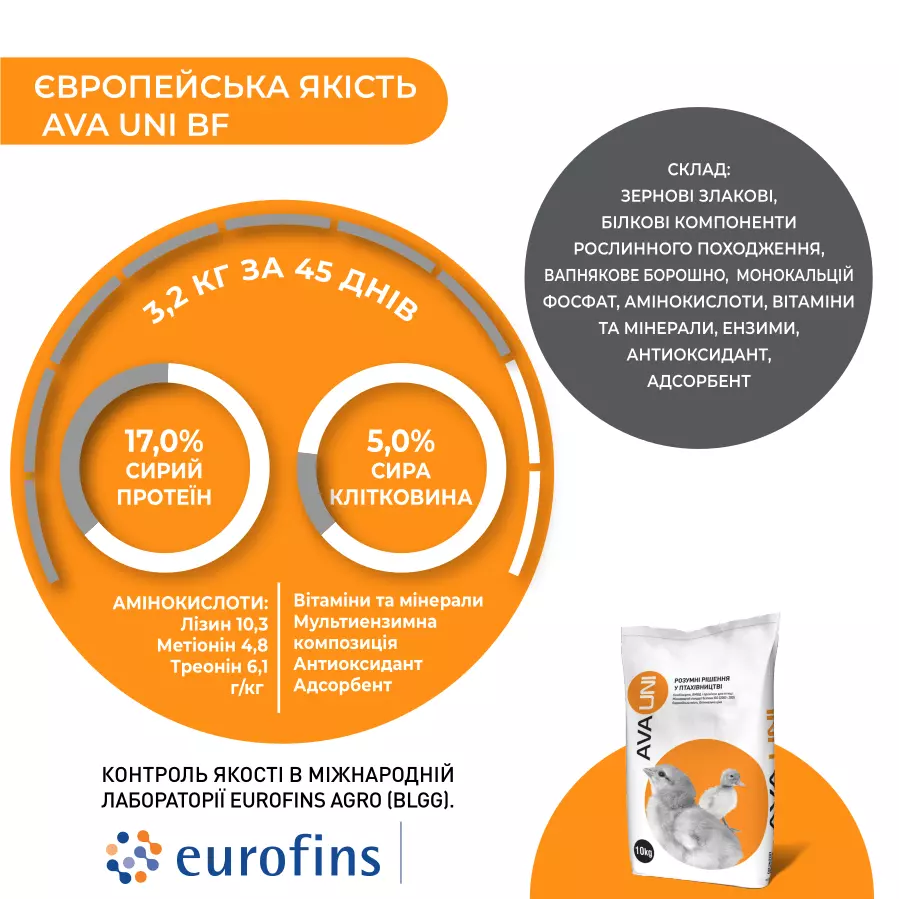 Комбікорм AVA UNI BF в своєму складі містить лише якісну сировину та європейські кормові добавки, котрі забезпечують інтенсивне засвоєння поживних речовин корму, роблячи їх доступними. Використовуючи комбікорм AVA UNI BF курчата-бройлери будуть забезпечені всім необхідним для інтенсивного  приросту живої маси у фінішний період та м’ясо матиме відмінні смакові якості