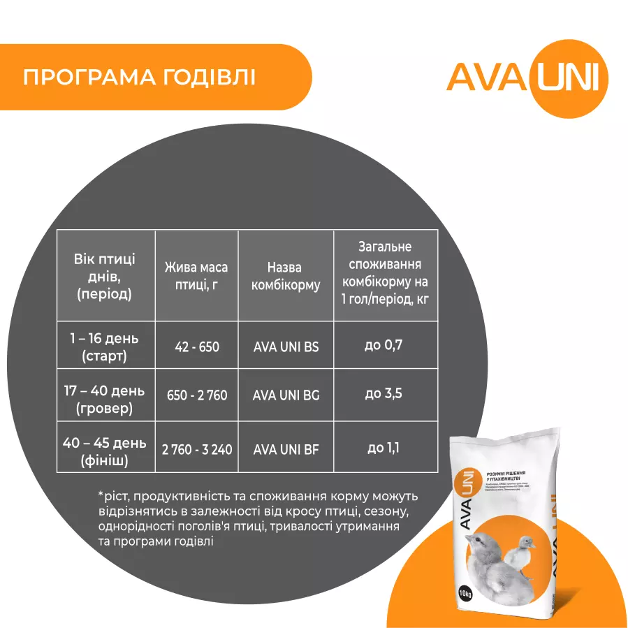 Лінійка кормів AVA UNI стимулює інтенсивний ріст та досягнення відмінних показників продуктивності сучасних кросів та порід птиці, допомагаючи їй повністю розкрити свій генетичний потенціал. Рецептура кормів AVA UNI  була розроблена провідними нутриціоністами компаній AVA GROUP та Feedlance B.V. (Нідерланди), використовуючи сучасні підходи та програми годівлі