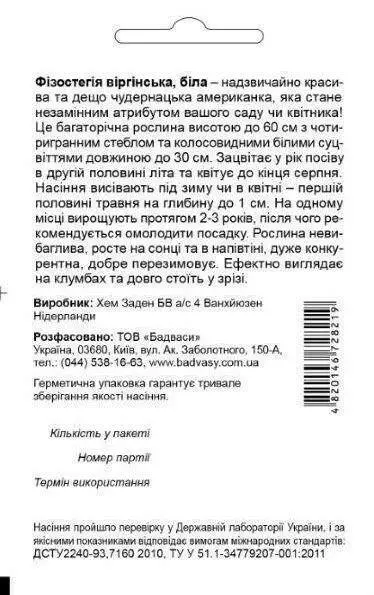 Фізостегія віргінська, біла – надзвичайно красива та дещо чудернацька американка, яка стане незамінним атрибутом вашого саду чи квітника! Це багаторічна рослина висотою до 60 см з чотиригранним стеблом та колосовидними білими суцвіттями довжиною до 30см. Зацвітає у рік посіву в другій половині літа та квітує до кінця серпня. Насіння висівають під зиму чи в квітні – першій половині травня на глибину до 1см. На одному місці вирощують протягом 2-3 років, після чого рекомендується омолодити посадку. Рослина невибаглива, росте на сонці та в напівтіні, дуже конкурентна, добре перезимовує. Ефектно виглядає на клумбах та довго стоїть у зрізі.