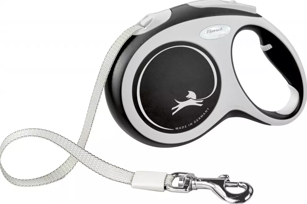 5 м стрічковий повідець Для собак вагою до 60 кг Індивідуальна система регулювання ручки Комфортна короткохідна гальмівна система М'яка ручка Хромований карабін Вага продукту: 520 г ок. Продумані аксесуари, які є корисним доповненням Flexi (окремо): 1.Світлодіодна система LED Lighting System з переднім і заднім ліхтарем висвітлює шлях і попереджає водіїв та пішоходів.