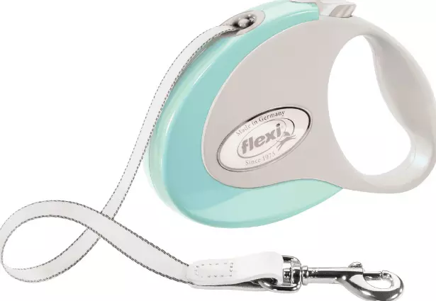 Ремінною повідець довжиною 5 м Для собак вагою до 25 кг Прогумовані компоненти Комфортна гальмівна система Хромована застібка Вага повідця: прибл. 240 г Колір: м'ята.
