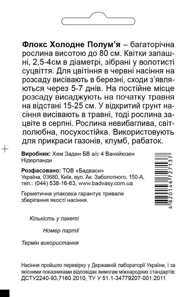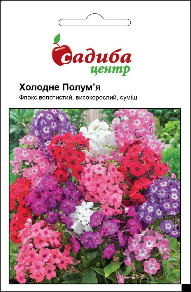 Флокс Холодне Полум’я – багаторічна рослина висотою до 80 см. Квітки запашні, 2,5-4см в діаметрі, зібрані у волотисті суцвіття. Для цвітіння в червні насіння на розсаду висівають в березні, сходи з’являються через 5-7 днів. На постійне місце розсаду висаджують на початку травня на відстані 15-25 см. У відкритий грунт насіння висівають в травні, тоді рослина зацвіте в серпні. Рослина невибаглива, світлолюбна, посухостійка. Використовують для прикраси газонів, клумб, рабаток.