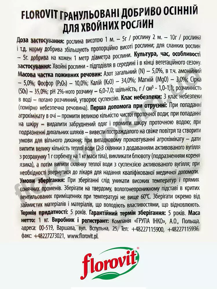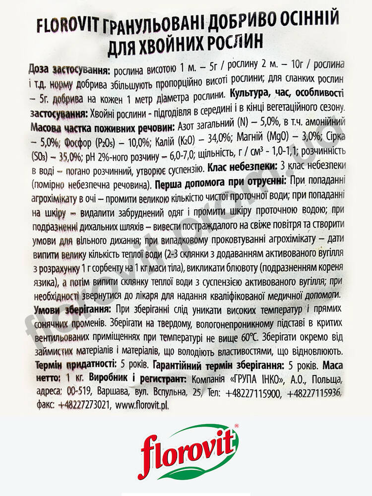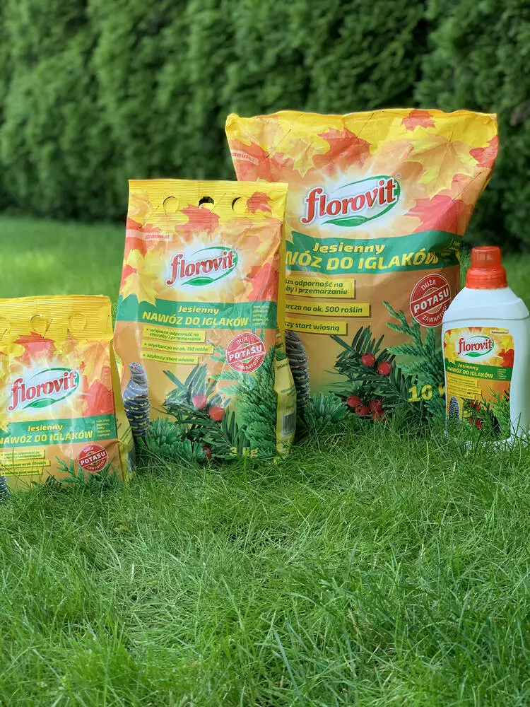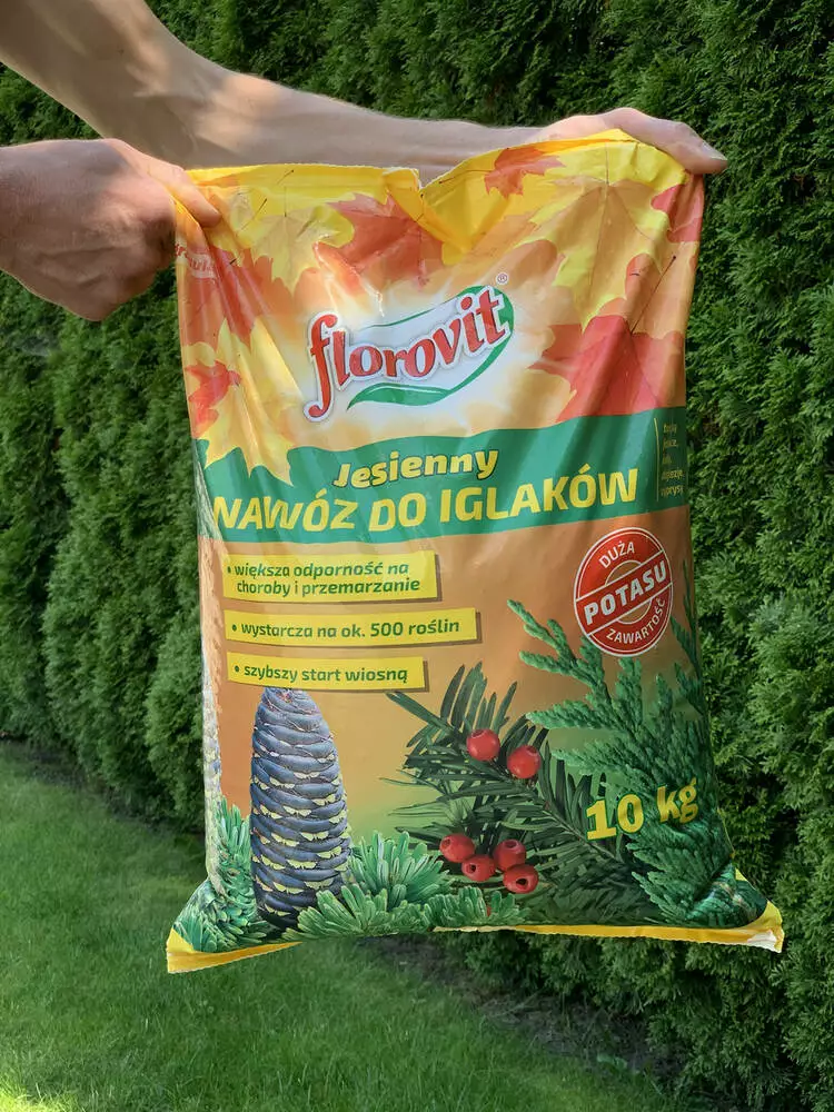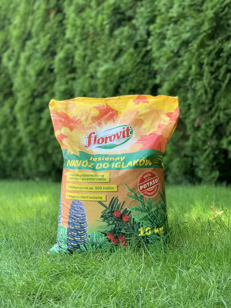 Добриво призначене для добрива дерев хвойних чагарників методом розсипання з метою їх підготовки до зимового періоду. Компоненти і мінерали добрива позитивно впливають на механізм одеревинения тканин рослин, що захищає хвойні рослини і дерев від вимерзання. Если Ви не застосовували добриво восени його слід застосовувати навесні — безпосередньо перед початком вегетації, що поліпшить умови росту і розвитку рослин у весняний період.