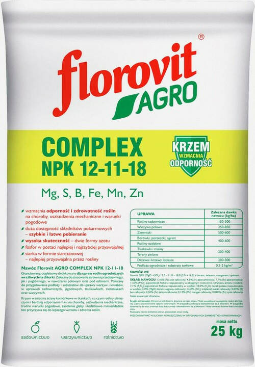 NPK добриво (MgO + SO3) 12,0 - 11,0 - 18,0 (3,0 + 16,0) з бором, залізом, марганцем, цинком.