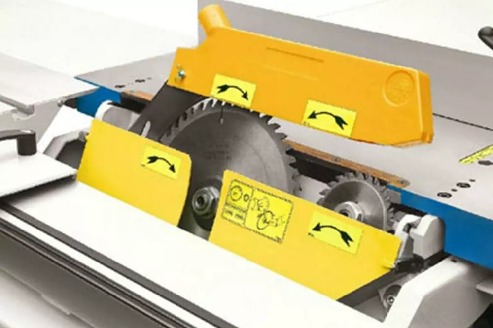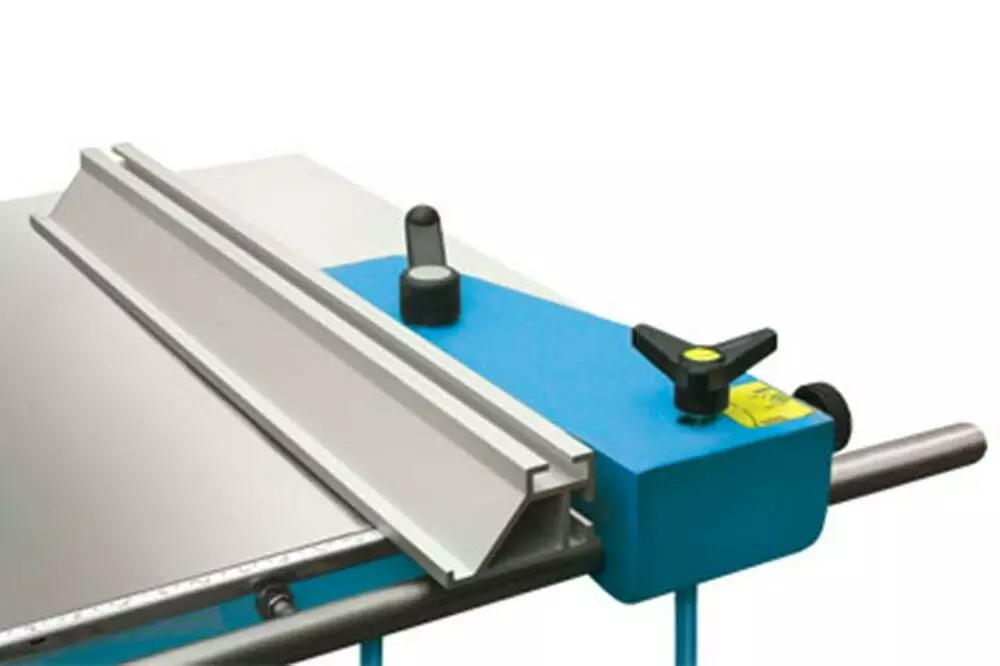 Форматный алюминиевый стол со закаленные стальные направляющие. Телескопическая поворотная линейка 900 мм с двух поворачивающихся упоров. Линейка для параллельный пропил с микрометрическая настройка. Уширение стола для ширина пропила 950 мм. Наклонения диска до 45° со считывание по шкалу.
