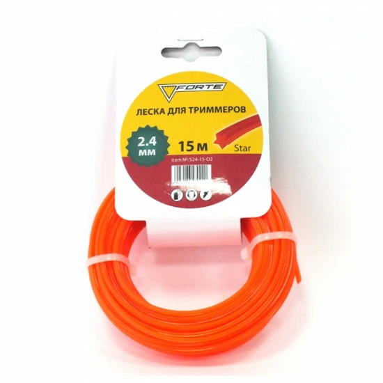 Forte 2.4 мм х 15 м Леска для мотокос звезда Сечение имеет форму звезды. Такие острые грани хорошо улучшают аэродинамику и способствуют хорошему качеству кошения.