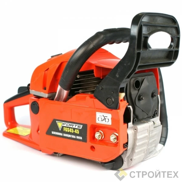 Forte FGS 45-45 Бензопила цепная Защита: От обратного удара (моментальная остановка цепи) Защита рук Безопасный выключатель Особенности: Легкий старт Повышенный ресурс двигателя Хромированное покрытие стенок цилиндра Поршень имеет два кольца Эффективная антивибрационная система Регулировка подачи масла Высококачественный противоударный пластик