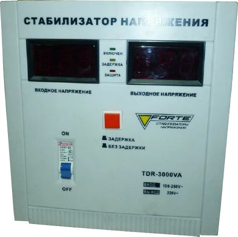Forte TDR-3000VA Стабилизатор напряжения При подключении приборов и бытовой техники к нестабильным по напряжению электрическим сетям отличной защитой устройств является стабилизатор напряжения. Он предназначен для сглаживания скачков напряжения в сети и выдачи величины в допустимых параметрах. Устройство FORTE TDR-3000VA стабилизирует входное напряжение в пределах от 130 до 260 В, выдавая на выходе однофазный ток напряжением 220 В. Прибор имеет цифровой вольтметр для удобства индикации параметров сети. Стабилизатор имеет металлический корпус с входными и выходными разъемами, выполненными в виде клемм. Устройство рассчитано на подключение нагрузки в 3 кВА. Точность стабилизации выходных параметров по напряжению прибора составляет 8%. Это допустимая величина согласно требованиям о нормированных отклонениях напряжения. Такая погрешность не влияет на работу устройства и обеспечивает надежную защиту электропотребляющего оборудования. Стабилизатор напряжения защитит бытовую технику и продлит срок ее эксплуатации. У него хорошая перегрузочная способность. Вес и размеры устройства не требуют выделения особого места под его установку. В прибор встроена фильтрация помех сети, которая в свою очередь не затрагивает амплитуду тока. Стабилизатор напряжения FORTE TDR-3000VA можно использовать для защиты бытовой техники в домашних условиях или на работе. Также он подойдет для подключения дачного оборудования. Быстродействие стабилизатора является его одним из важных критериев. Чем оно выше, тем быстрее прибор откликается на изменение величины входного напряжения. Такая реакция устройства измеряется в миллисекундах и составляет 5-7 единиц. Это промежуток времени, за который стабилизатор изменяет отклонившееся от нормы входное напряжение на 1 Вольт. Надежность устройства обеспечивается его защитами от таких факторов: повышенного и пониженного напряжения, токов короткого замыкания, перегрузки, высоковольтных импульсов, перегрева (тепловая защита). После срабатывания любой из защит, стабилизатор автоматически возобновляет свою работу. Это очень удобная функция, особенно при высокой занятости людей в офисе. Работа стабилизатора тихая, что не нарушит комфорт людей, находящихся в помещении. Установка имеет систему противодействия залипанию контактов и автоконтроль за температурой трансформатора.