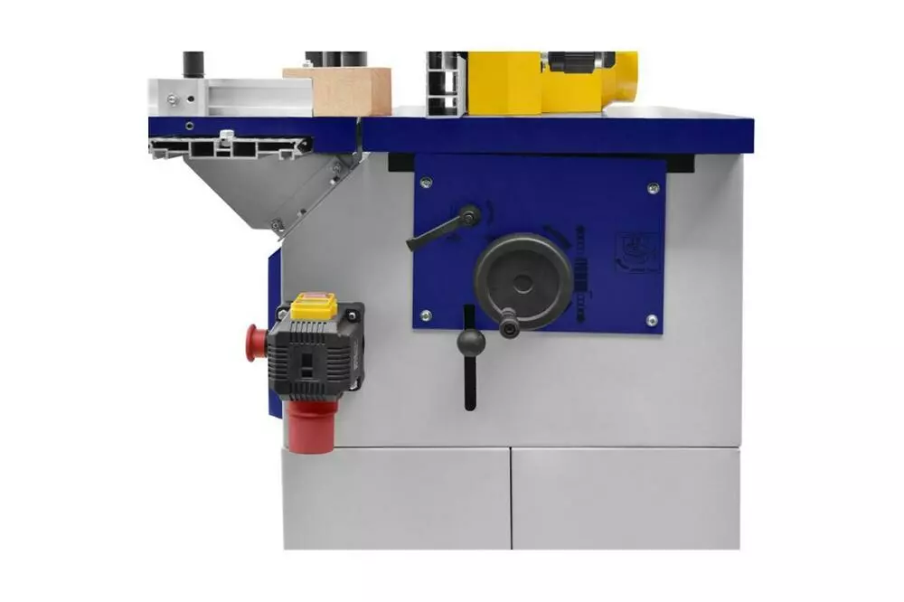 Выдвижной шпиндель 30 мм вращается со скоростью 6500 об/мин в верхней части корпуса находится механизм поддреживающий обрабатываемый материал. Станок идеален, как для профессионалов так и столяров аматоров.