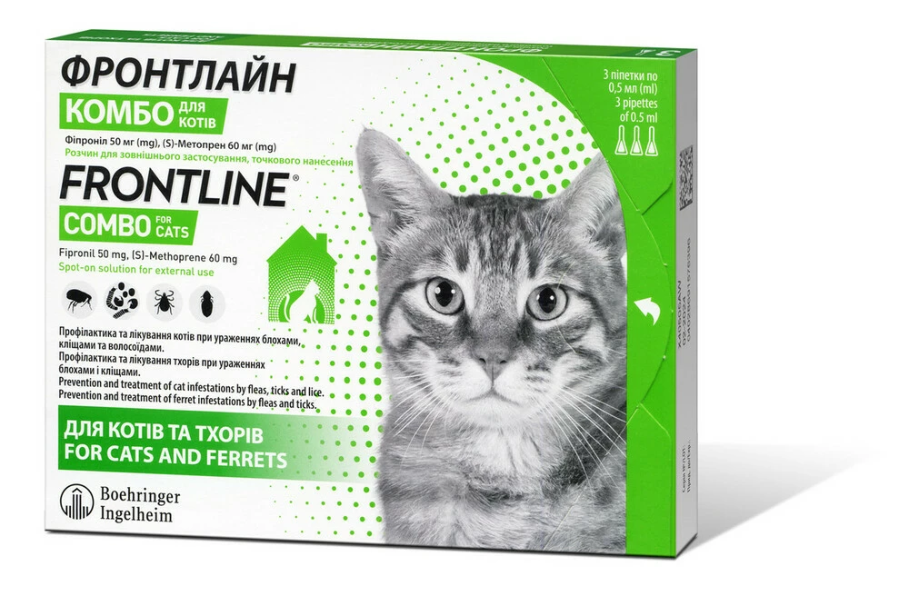 Фронтлайн Комбо має виражену контактну інсектоакарицидну дію.